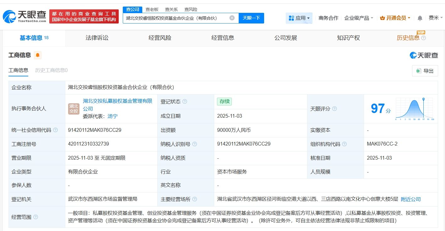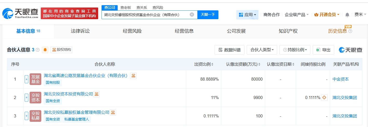 天眼查工商信息显示,近日,湖北交投睿恒股权投资基金合伙企业(有限合伙)成立,执行事务合伙人为湖北交投私募股权基金管理有限公司,出资额9亿人民币,经营范围为私募股权投资基金管理、创业投资基金管理服务,以私募基金从事股权投资、投资管理、资产管理等活动。合伙人信息显示,该基金由湖北省高速公路发展基金合伙企业(有限合伙)、湖北交投资本投资有限公司、湖北交投私募股权基金管理有限公司共同出资。