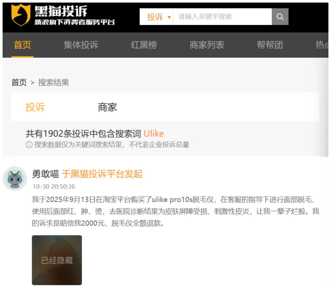 消费者投诉方面,Ulike的问题同样严重。黑猫投诉平台显示,截至2025年12月21日,以“Ulike”为关键词的投诉量达1902条,投诉集中在虚假宣传、产品质量问题、售后态度恶劣等方面。例如,有消费者反映,“2025年9月13日在淘宝平台购买了Ulike pro10s脱毛仪,在客服的指导下进行面部脱毛,使用后面部红、肿、烫,去医院诊断结果为皮肤屏障受损、刺激性皮炎,让我一辈子烂脸。”