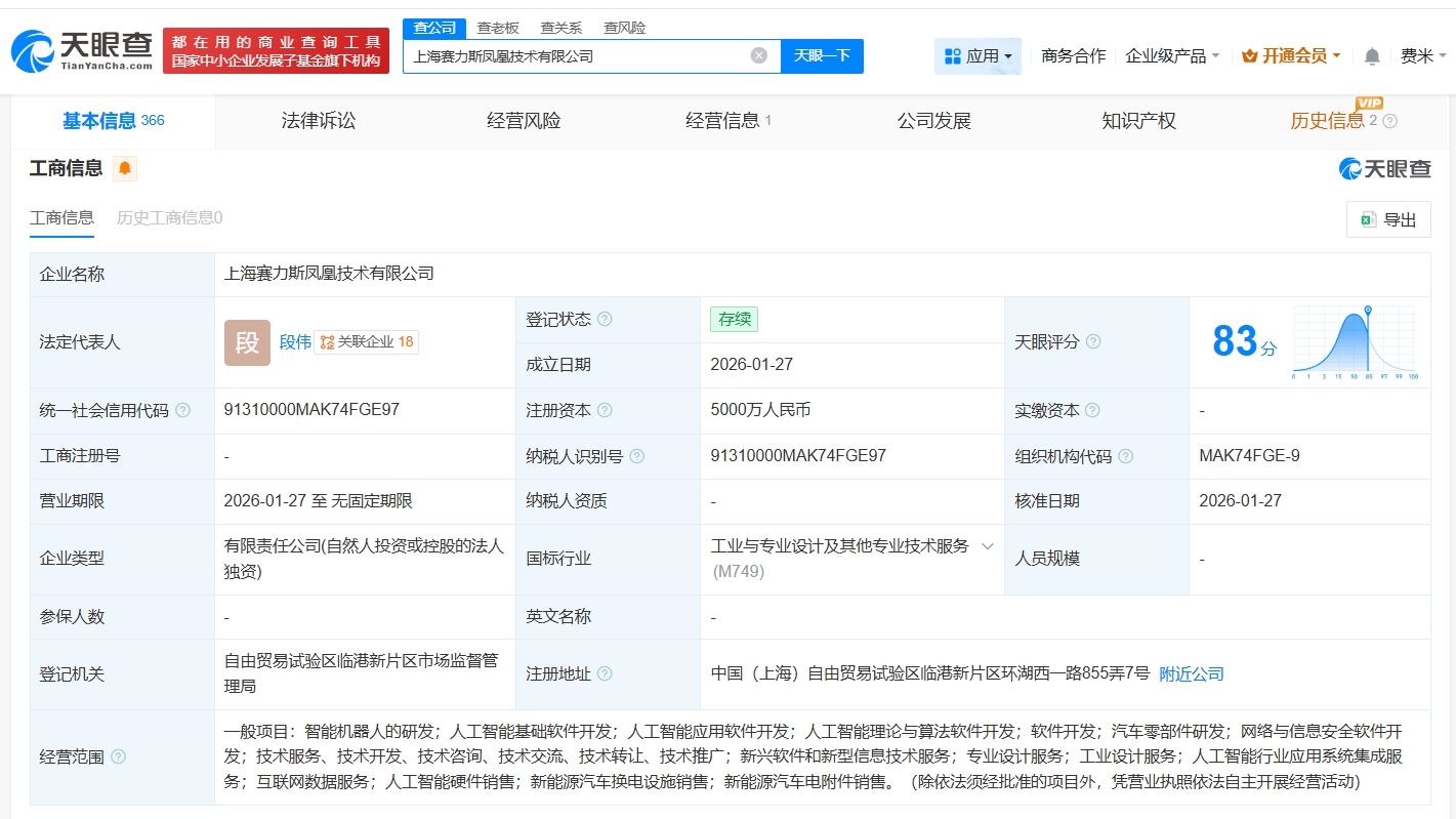 天眼查工商信息显示,近日,上海赛力斯凤凰技术有限公司成立,法定代表人为段伟,注册资本5000万人民币,经营范围包括智能机器人的研发、人工智能基础软件开发、人工智能应用软件开发、人工智能理论与算法软件开发等。