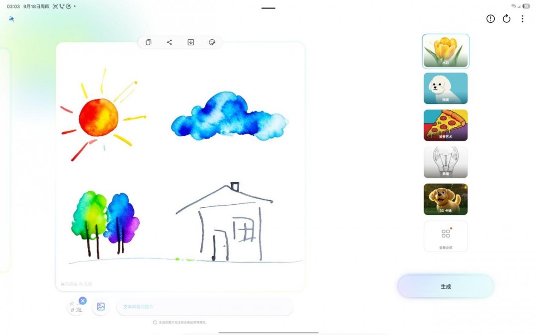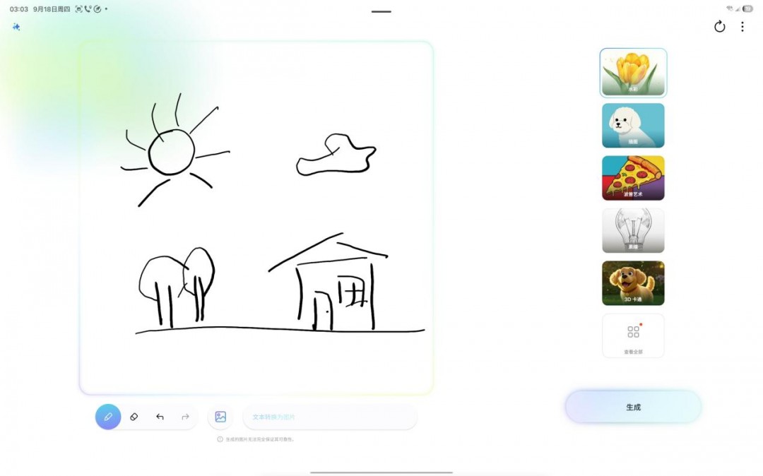 以绘图助手为例,对于喜欢画画但没有太多绘画基础的人来说,它简直就是“救星”。比如想要画一幅风景画,我们只需要在平板上简单涂鸦几笔,它就能把那些杂乱的线条准确地识别并转化成不同风格的精致图画,色彩填充得也特别好看,就像是专业画师画出来的一样。