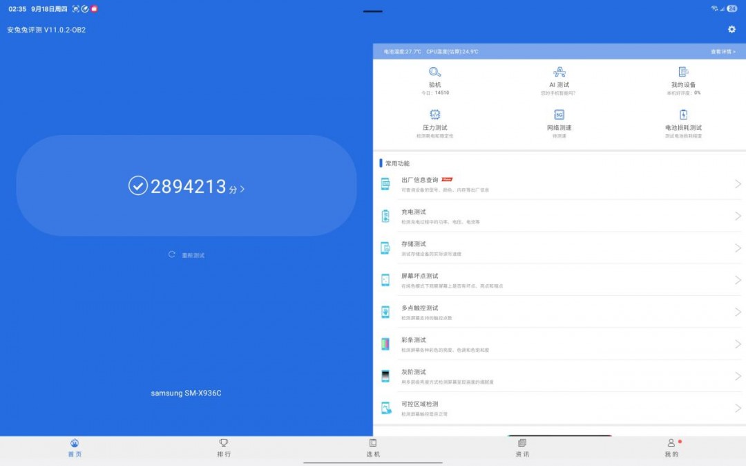 为了更直观地了解三星Galaxy Tab S11 Ultra的性能,我们专门用安兔兔对它进行了测试。结果真的让我大吃一惊,它的安兔兔跑分居然达到了289万,这个成绩在平板领域里,绝对是顶尖的水平,甚至比很多旗舰手机的跑分还要高。