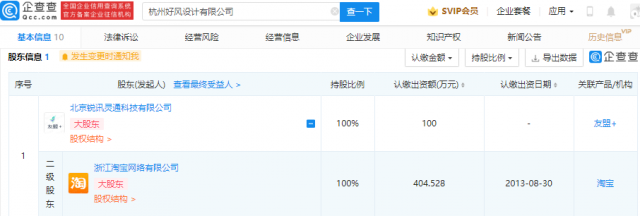 企查查股权穿透显示,该公司由北京锐讯灵通科技有限公司100%控股,后者为浙江淘宝网络有限公司全资子公司。