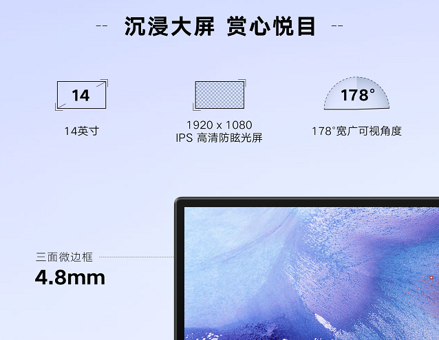 而华为MateBook D 14仅4.8mm的三面窄边框设计可带来极强的视觉沉浸感,配备屏占比高达84%的1080P IPS防眩光全面屏,呈现生动逼真的画面效果。