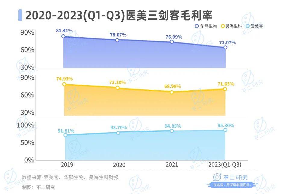 「不二研究」据其三季报发现:今年前三季度,华熙生物、爱美客、昊海生科的净利润增长率分别为-24.07%、43.74%、102.04%。目前,医美三剑客业绩出现分化:昊海生科营收净利表现稳定;爱美客营利增速略逊一筹;而华熙生物营收净利双降,在 「不二研究」看来,华熙生物的净利润下滑,主要原因在于其功能性护肤品营收下滑及毛利率下降;与此同时,其不断扩大护肤品C端市场,销售费用大幅提高也是导致其业绩下滑的原因之一。