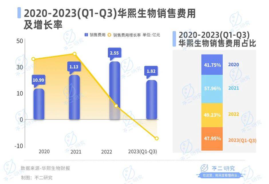 据华熙生物财报显示,其2020-2023年前三季度销售费用分别为10.99亿元、24.36亿元、30.49亿元、19.43亿元;分别同比增长110.84%、121.66%、25.16%、-36.27%;营收占比分别为41.75%、57.96%、49.23%、47.95%。