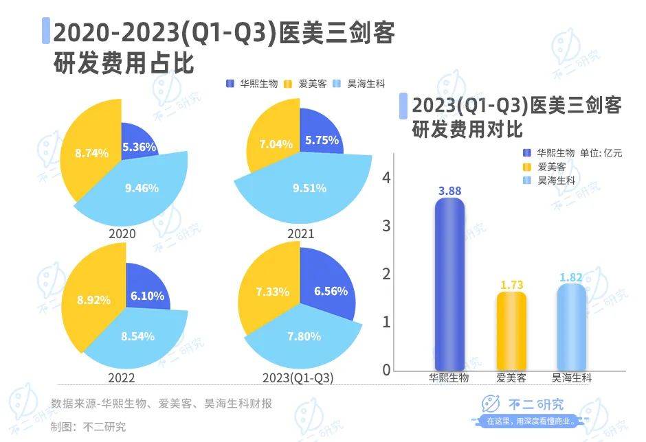 至此,美得妥旗下三款肉毒毒素产品许可全部被吊销。这对于华熙生物而言,无疑是一记打击,其借力拓展瘦脸针业务的计划也暂时落空。 今年9月5日,华熙生物发公告称韩国公司Medytox已同意终止合资协议和独家代理协议,但索赔的仲裁目前暂未开庭审理。 爱美客在2018年开始布局肉毒素市场,2021年收购韩国肉毒素品牌Hunons 25.42%股权。据爱美客在2023年3月28日的投资者调研纪要称“其注射用A型肉毒毒素已经完成III期临床试验,目前正在整理注册申报阶段”。 与此同时,昊海生科通过股权投资进入肉毒素和小分子药物领域,目前在医美领域形成“玻尿酸+肉毒素+光电设备”的产品组合布局。 「不二研究」认为,除了布局肉毒素外,医美三剑客新品研发储备亦是引领未来的重要因素。只有不断创新和推出新的产品线,才能在激烈的市场竞争中立于不败之地。 据医美三剑客财报显示,华熙生物2020-2023年前三季度研发费用率分别为5.36%、5.75%、6.10%、6.56%;同期,昊海生科的研发费用率为9.46%、9.51%、8.54%、7.80%;而爱美客同期研发费用率为8.74%、7.04%、8.92%、7.33%。 华熙生物研发费用率为医美三剑客中最低,但这主要由于华熙生物营收体量大。从绝对数值看,华熙生物研发费用投入最大,2023年前三季度为3.88亿元,同期昊海生科和爱美客分别为1.82亿元和1.73亿元。