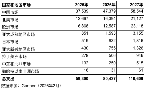 从区域市场来看,预计中东和非洲(89%)、亚太成熟地区(87%)及欧洲(83%)将在2026年实现主权云IaaS支出的最高增长。虽然2026年中国和北美预计将分别以470亿美元和160亿美元的支出位居全球前两位,但这两个市场的增长率均在20%左右。预计到2027年,欧洲将在主权云IaaS支出上超过北美。