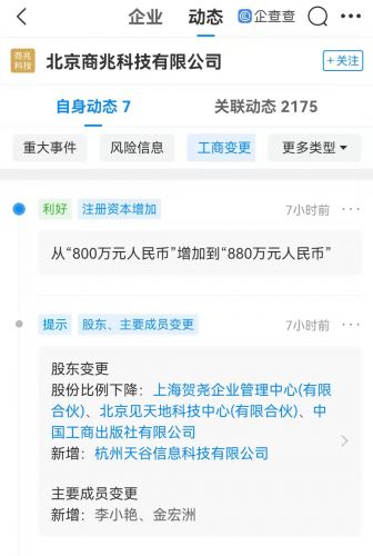 【TechWeb】企查查APP显示,近日,北京商兆科技有限公司发生工商变更,新增蚂蚁集团关联公司杭州天谷信息科技有限公司为股东,同时公司注册资本由800万元人民币增加至880万元人民币。