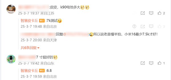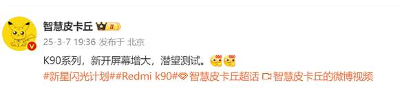 据知名数码博主@智慧皮卡丘 最新发布的信息显示,与此前曝光的消息基本一致,全新的REDMI K90系列将采用一块增大的6.8英寸屏幕,分辨率预计为2K,并且正在对潜望镜头进行测试。结合此前相关爆料,该机将采用50MP潜望式长焦镜头,支持大光圈和长焦微距拍摄,弥补了前代在影像方面的短板。而针对网友关于该机电池容量的问题,该博主回应称,目前正在测试7000mAh的电池。