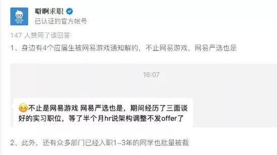 知乎上“噼啊求职”发帖称,今年身边有4个应届生被网易游戏通知解约,不止网易游戏,网易严选也是。