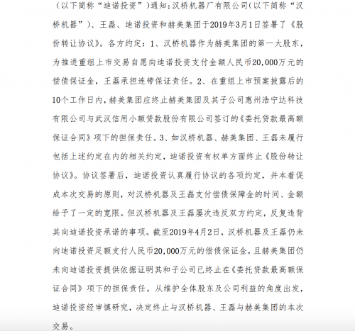 公告显示,截至2019年4月2日,汉桥机器及王磊仍未向迪诺投资足额支付人民币20,000万元的偿债保证金,且赫美集团仍未向迪诺投资提供依据证明其和子公司已终止在《委托贷款最高额保证合同》项下的担保责任。从维护全体股东及公司利益的角度出发,迪诺投资决定终止与汉桥机器、王磊与赫美集团的本次交易。