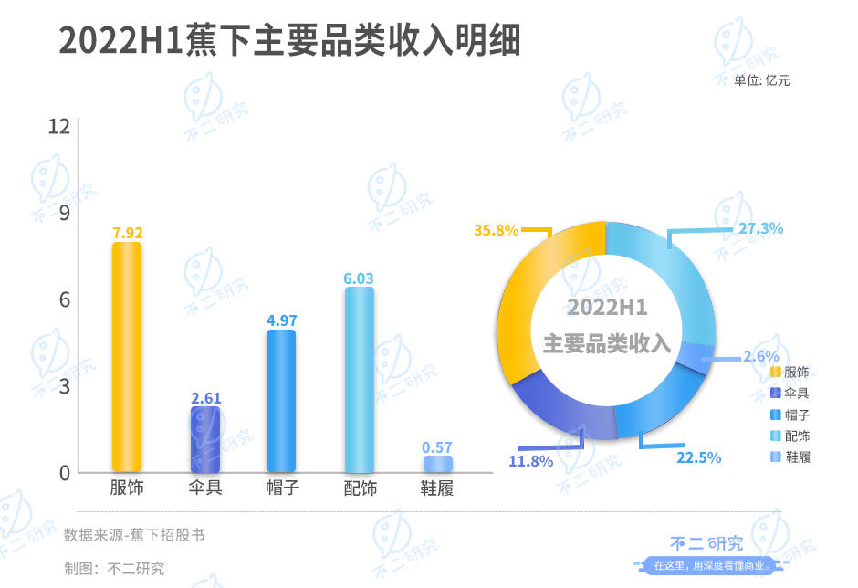 以蕉下2022上半年的营收为例,来自服装销售的营收为7.92亿元,占比35.8%;来自伞具的销售收入为2.61亿元,占比11.8%;来自帽子的销售收入为4.97亿元,占比22.5%,墨镜、口罩、袖套及手套等其他配饰共实现营收6.03亿元,占比27.3%,鞋履销售收入0.57亿元,占比2.6%。