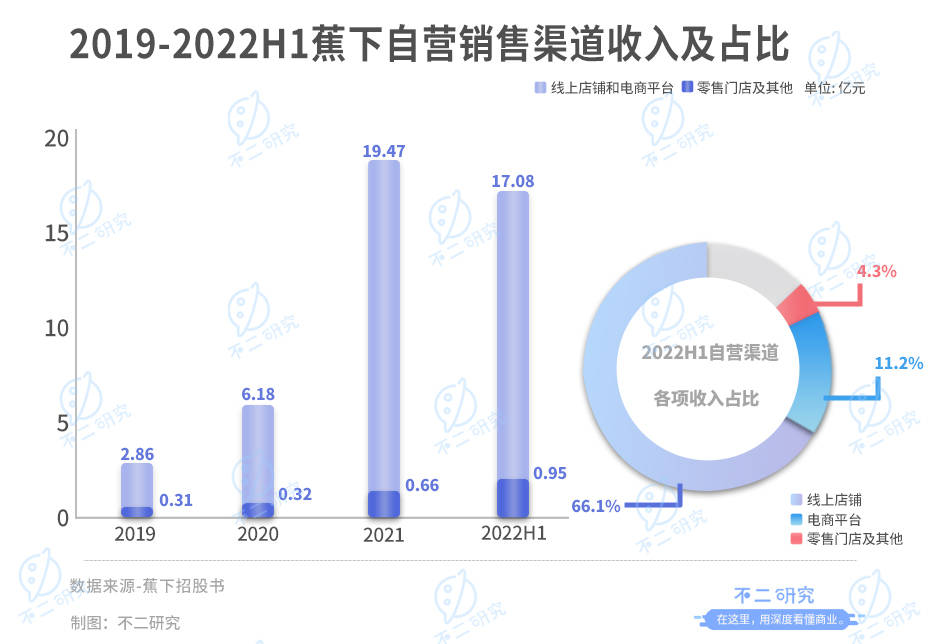 2019-2022上半年,蕉下线上店铺和电商平台产生的收入分别为2.86亿元、6.18亿元、19.47亿元和17.08亿元;通过零售门店及其他(主要包括向拥有成熟零售网络的大客户销售)产生的收入则分别为0.31亿、0.32亿、0.66亿元和0.95亿元。