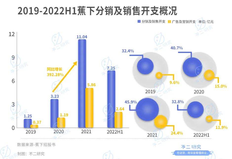或由于此,伴随互联网获客成本不断增高,蕉下的广告及营销开支也在不断增长:2019-2021年分别为 0.37亿元、1.19亿元、5.86亿元,在同期营收占比9.6%、15.0%、24.4%;仅在2021年,蕉下的广告及营销开支比去年暴增392.28%。2019-2021年,蕉下的分销及销售开支为1.25亿元、3.23亿元、11.04亿元,同期营收占比分别为32.4%、40.7%、45.9%。为了保证盈利,去年上半年蕉下削减了营销开支,其广告及营销费用占营收比,由去年同期的23.0%降低至11.9%,减少了一半还要多。