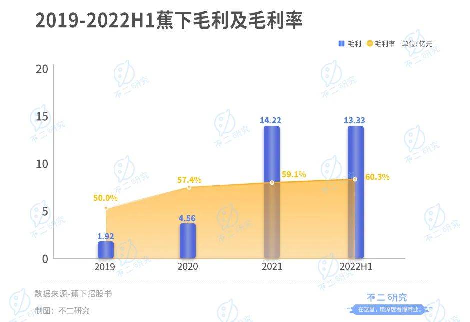 2019-2022上半年,蕉下的营收为3.85亿元、7.94亿元、24.07亿元和22.10亿元,对比2019-2021的高达105.1%的年复合增长率,增长速度开始出现明显放缓;同期,其毛利率也高达50.0%、57.4%、59.1%和60.3%,三年间提升了10个百分点。