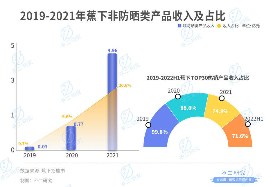 综合品类来看,2019-2021年,蕉下非防晒类产品收入分别为0.03亿元、0.77亿元、4.96亿元,营收占比分别为0.7%、9.6%和20.6%。