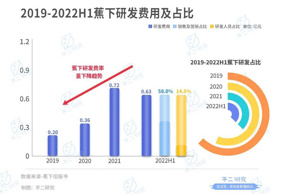 此外,据招股书显示,截止去年上半年,蕉下的销售及营销人员占比58.0%,研发人员占比仅为14.5%。