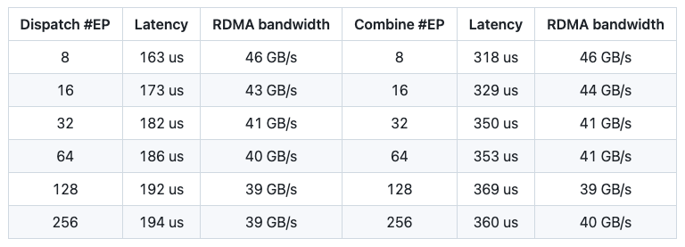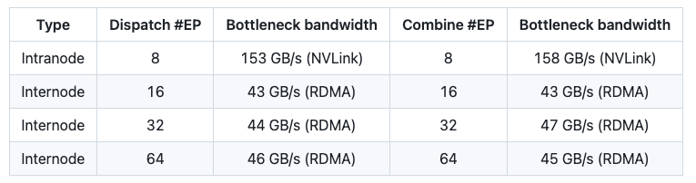DeepSeek还列出了DeepEP的实际性能: