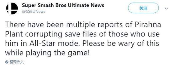 对于此事,游戏粉丝账号Super Smash Bros Ultimate News向玩家们发出了提示,在Twitter中写道:“有多个玩家报告称,在全明星模式中使用‘吞食花’将有可能造成游戏存档损坏的情况,请各位玩家在游玩时多多留意这个问题。”
