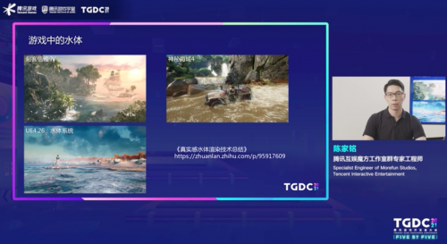 腾讯互娱魔方工作室群专家工程师陈家铭、腾讯互娱天美工作室群高级工程师胡有为共同介绍了腾讯互娱内部开源计划中的Aqua项目,以及该项目在可交互水体仿真和渲染技术方面的研究成果。胡有为表示,团队将水体的仿真和渲染全部通过GPU驱动的方式进行,大幅提升了模拟超大世界水体的性能和表现。