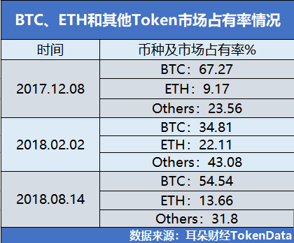 去年年末牛市的中期,BTC的市场占有率达到了67.27%,ETH占市场的9.17%,而在今年二月份的时候,随着从市场的巅峰回落,大饼的市值占有率进入了一个冰点,而以太坊的市值占有率突破了新高,达到了22.11%.