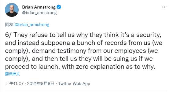对于监管的最新动作,Coinbase创始人兼CEO布莱恩·阿姆斯特朗也在周二深夜发布了二十余条推特,强调过去数年已经有上百万虚拟货币投资者借由这类项目获取收益,Coinbase只是最近才切入这项业务。阿姆斯特朗质疑监管将此类借贷项目视为证券的判断,并抨击SEC拒绝给出明确法律指引的行为,还提到今年五月他前往华盛顿特区会见监管机构时,只有SEC拒绝会面并表示“不会与任何加密货币企业见面”。