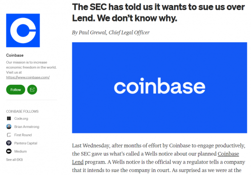 据文章表述,美国SEC上周向公司发出了威尔斯通知(Wells notice,执法部门计划采取行动前的通知),警告公司称如果继续推进用户用户出借(加密货币)账户资产并收取利息的项目,将会遭到执法部门的正式起诉。Coinbase对这一情况表达了惊讶,直言“不知道为什么会发生这种情况”,但同时也宣布将功能上线日期延后至十月。