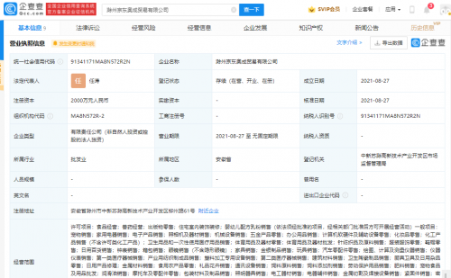 【TechWeb】企查查APP显示,8月27日,滁州京东奥成贸易有限公司成立,法定代表人为任涛,注册资本为2000万元人民币,公司经营范围含食品经营;兽药经营;出版物零售;住宅室内装饰装修;婴幼儿配方乳粉销售;家用电器销售;电子产品销售等。