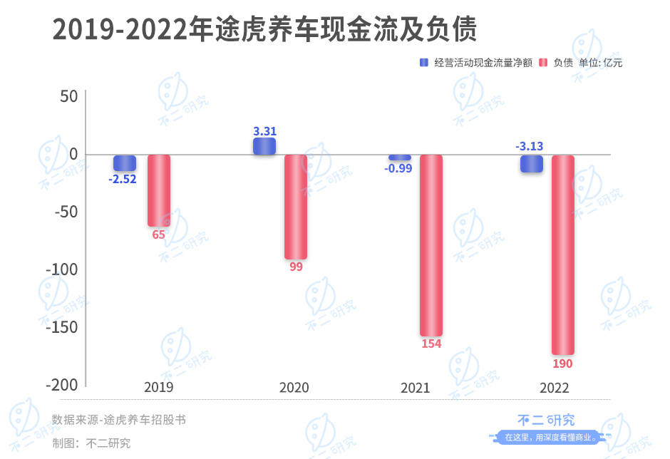 此外,截至2019-2022年,其经营活动产生的现金流量净额分别为-2.52亿元、3.31亿元、-0.99亿元和-3.13亿元;同期,分别录得净负债65亿元、99亿元、154亿元和190亿元,途虎养车解释称这些净负债主要是由于记为负债的大量可转换可购回优先股所致。