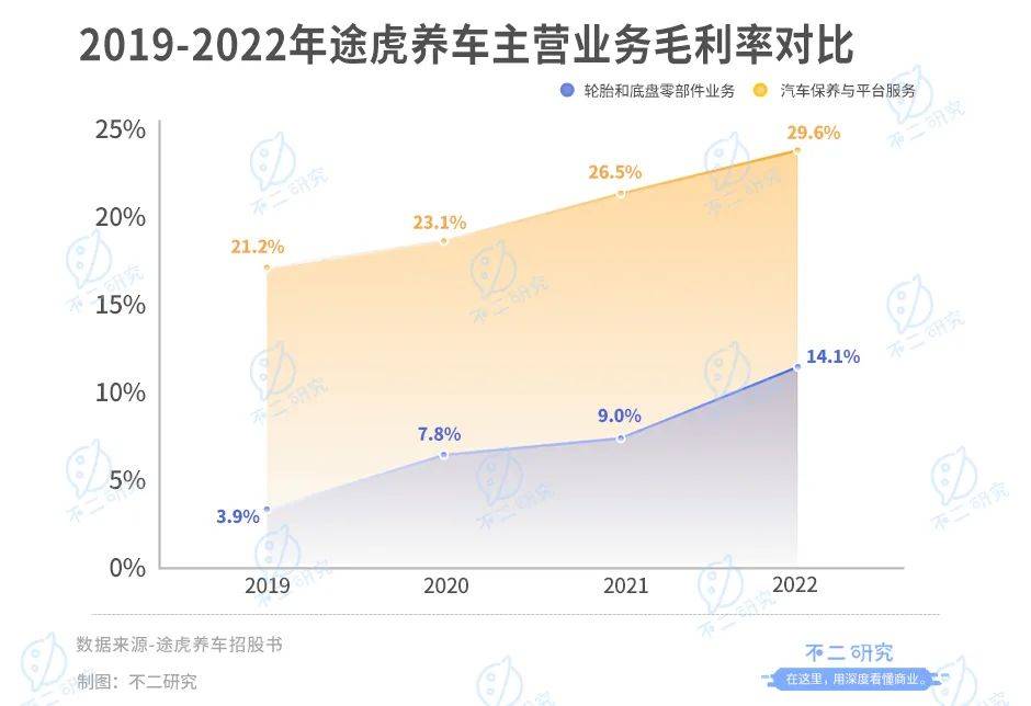 据此,业内人士戏称途虎养车更像一家汽车零配件销售公司。「不二研究」发现,尽管轮胎和底盘零部件业务,撑起途虎的半壁营收,但其毛利率偏低,同期的毛利率仅为3.9%、7.8%、9.0%和14.1%。
