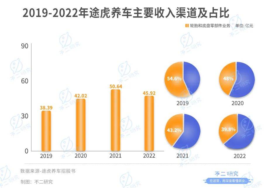 在综合汽车产品服务收入方面 ,来自轮胎和底盘零部件业务的收入占据核心位置,2019-2022年,其收入分别为38.39亿、42.02亿、50.64亿和45.92亿,当期营收占比54.6%、48.0%、43.2%和39.8%。