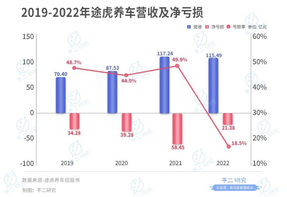 招股书显示,2019-2022年,途虎养车的营收为70.40亿元、87.53亿元、117.24亿元和115.49亿元。