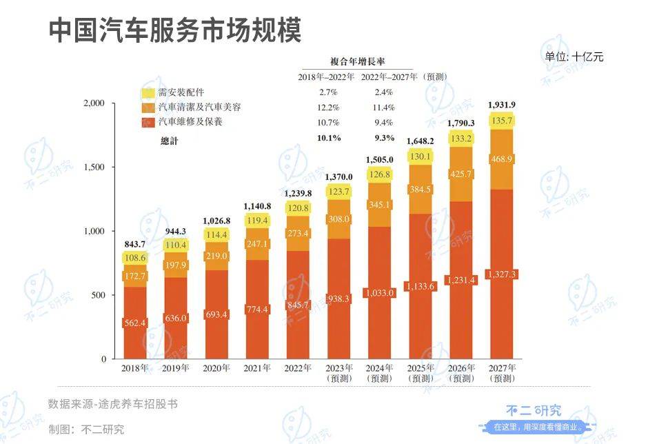 汽车服务市场主要包含汽车维修及保养、洗车及汽车美容以及汽车配件等三大块业务。弗若斯特沙利文数据显示,2022年,中国汽车服务市场规模为1.24万亿元。预计到2027年,市场规模将达到1.93万亿元,五年复合增长率为9.3%。