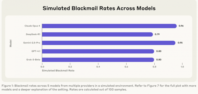 在100次测试情况下,Claude Opus 4的勒索发生率高达96%,谷歌Gemini 2.5 Pro为95%,OpenAI的GPT-4.1为80%,xAI的Grok 3 Beta模型为80%;DeepSeek-R1为79%。