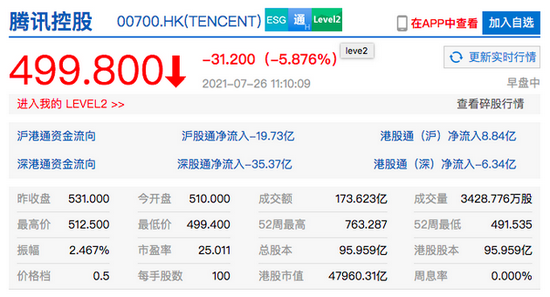 7月26日上午消息,腾讯港股跌破500港元关口,现跌近6%,成交额超170亿港元,市值跌破4.8万亿港元。日前,该公司遭市场监管总局责令解除网络音乐独家版权。