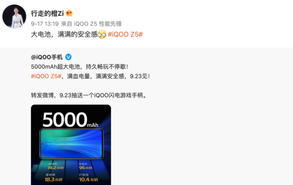 iQOO Z5内置5000mAh大电池:超长续航安全感爆棚快报