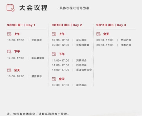 IT之家注意到,官方议程显示海思将于 10:00~12:00 举行主题演讲,然后于 14:00 至 17:00 举行新品发布会,第二天还将举行星闪峰会、音视频峰会、鸿蒙峰会、白电峰会、渠道伙伴大会。
