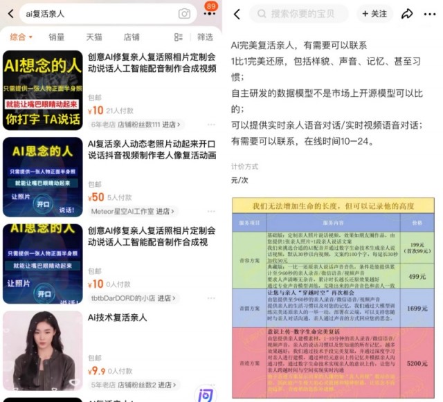 在一些电商平台,搜索“AI复活亲人”,也能看到不少做相关生意的店铺,声称“只需提供一张亲人高清个人照和音频,就能帮你实现愿望”,价格低至9.9元,几十上百元的也有。这种用的多是市场上的开源模型。