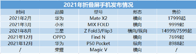 OPPO发布了旗下首款折叠屏手机Find N,售价7699元起,是目前售价较低的横向折叠屏手机;华为发布了旗下首款纵向折叠屏手机P50 Pocket,售价8988元起;荣耀近日也刚刚宣布,旗下首款折叠屏旗舰荣耀Magic V即将到来。
