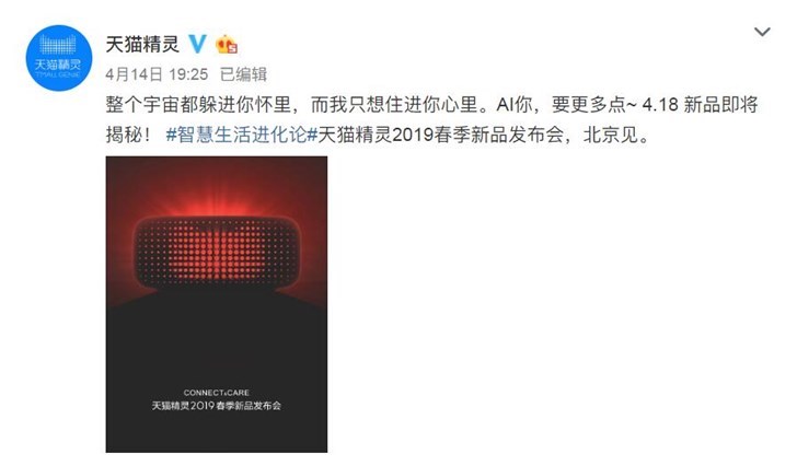 天猫精灵2019春季新品发布会将在4月18日进行,阿里巴巴人工智能实验室团队或许还有更多新品推出,届时IT之家也会进行全程报道。