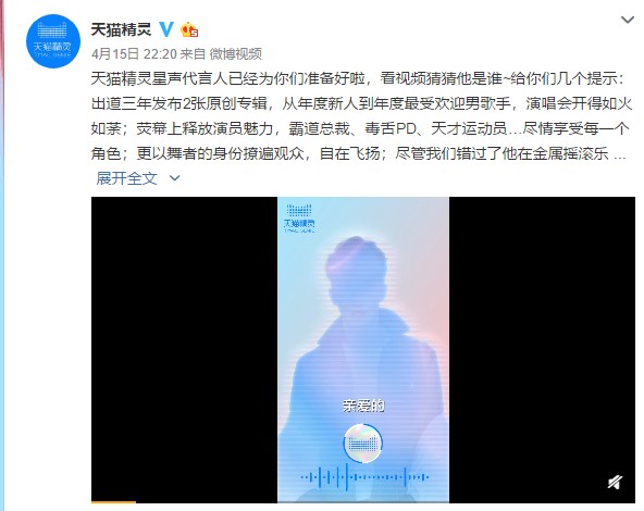 在最新的一条微博中,天猫精灵还公布了“星声代言人”,他出道三年发布两张原创专辑,除了是一名歌手外,他还饰演过霸道总裁、毒舌PD、天才运动员等角色,大家猜出他是谁了吗?