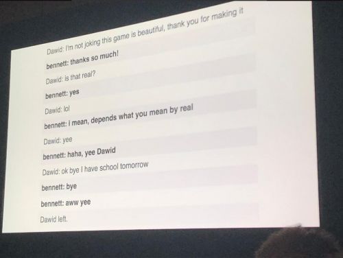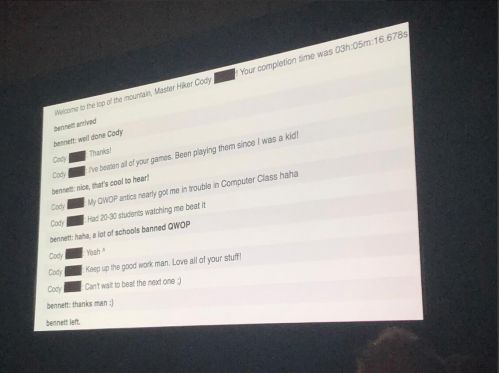 游戏开发者班尼特福迪在台上向所有在场的观众分享了这个秘密,看来通关的玩家们还是十分遵守与开发者的约定的,的玩家会被邀请至作者班尼特·福迪主持的聊天室。