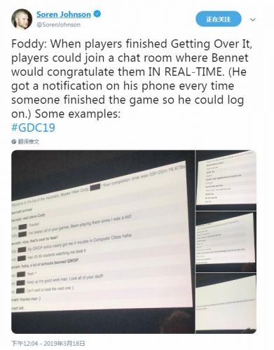 正如上图,那些成功通关“掘地求升”的玩家会被邀请至作者班尼特·福迪主持的聊天室,而作者会接到邀请上线亲自恭喜玩家,十分呼应游戏“与班尼特福迪一起”的主题。