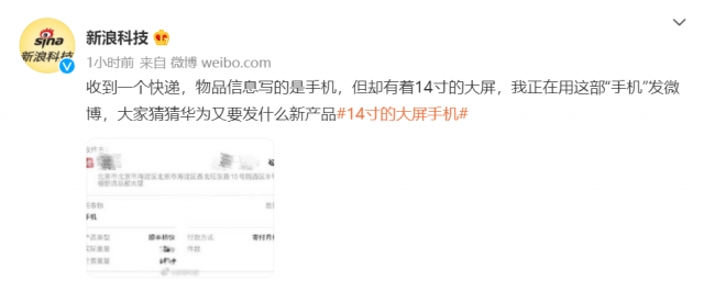 紧随官方官宣发布会信息之后的是@新浪科技首发微博爆料新品信息,内容为一张快递单据以及附带的一则# 14寸的大屏手机#超话内容,这个关键词引发众多网友热议。