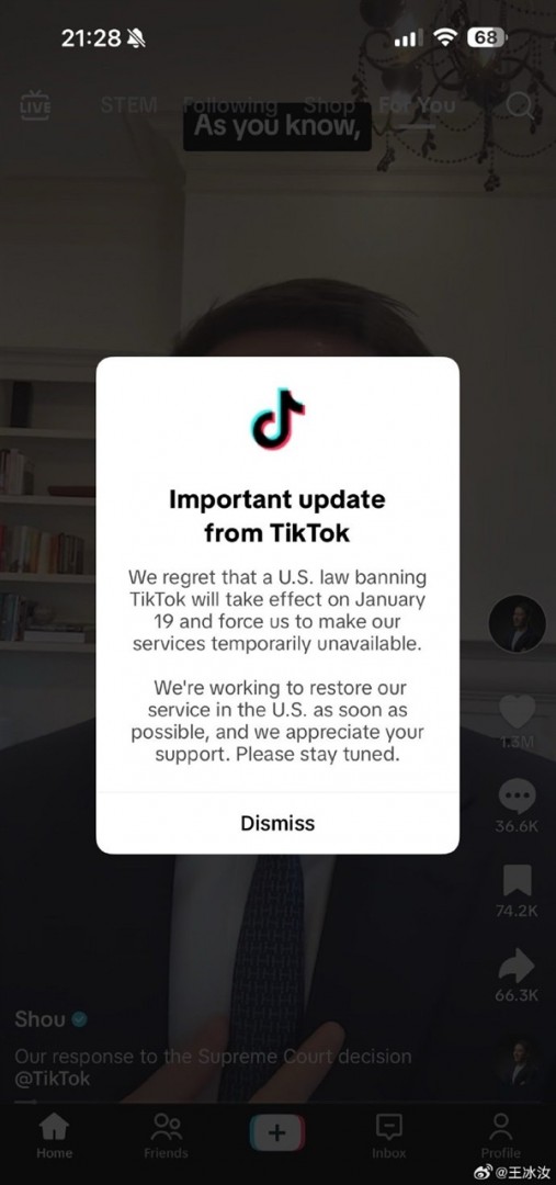 【TechWeb】1月19日消息,当地时间1月18日晚,TikTok发布重要消息提示,将暂时对1.7亿美国用户停止服务。