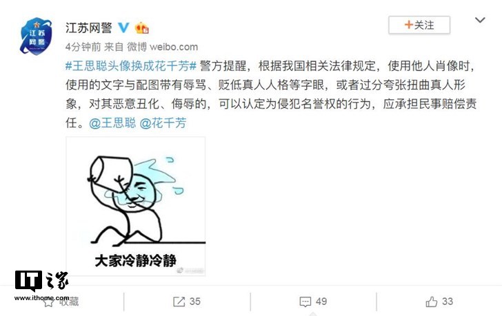 这事竟引来了江苏网警,@江苏网警 发微博称,“#王思聪头像换成花千芳# 警方提醒,根据我国相关法律规定,使用他人肖像时,使用的文字与配图带有辱骂、贬低真人人格等字眼,或者过分夸张扭曲真人形象,对其恶意丑化、侮辱的,可以认定为侵犯名誉权的行为,应承担民事赔偿责任。”