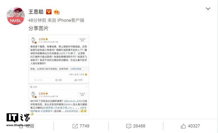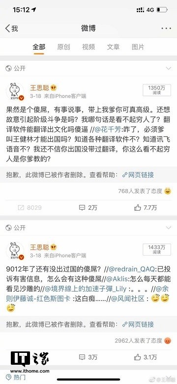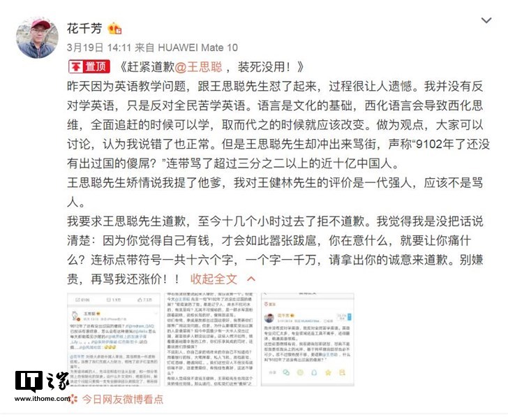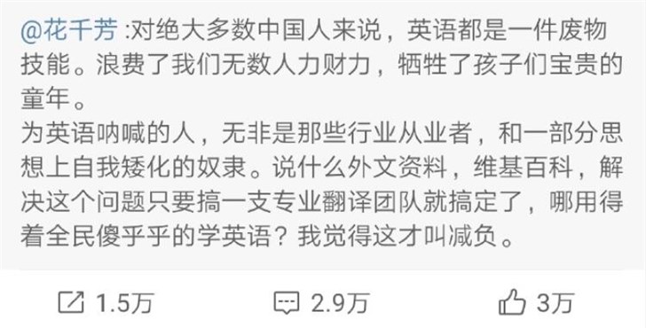 原来,近日,花千芳和王思聪因为“学英语”展开互怼,引起网友热议。花千芳认为:“对绝大多数中国人来说,英语是一件废物技能。浪费财力同时也牺牲了孩子宝贵的童年。”此话一出,立即引发争议,并惹来王思聪发文“回怼”:“9012年了还有没出过国的傻X?”