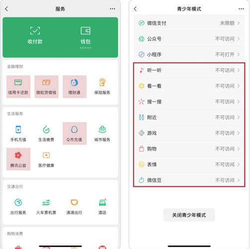 微信支付会隐藏Q币充值、微粒贷、理财通、信用卡的入口。看一看、附近的人、微信豆,以及所有的小游戏,均为默认不可访问状态,且无法进行设置修改。