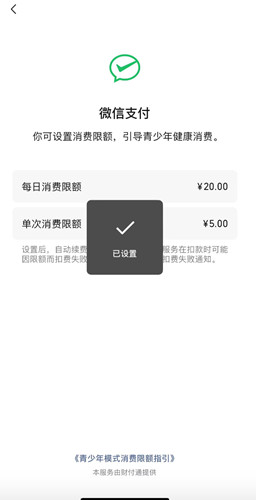 父母或监护人可以在青少年模式中设置微信支付的限额,包括“每日消费限额”和“单次消费限额”。完成设置后,青少年使用微信支付时,将会受到已设置的额度限制。