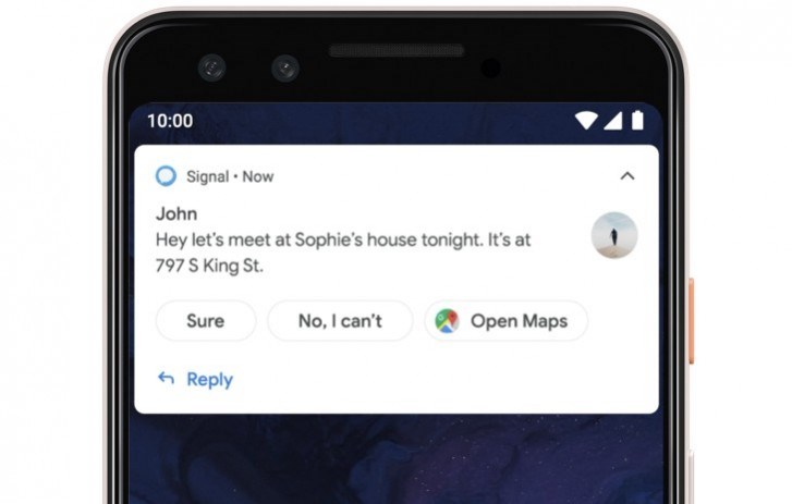 另外一个由设备机器学习驱动的功能是智能回复,将无缝地适用于Android Q中的所有消息应用,为回复提供有用的建议,同时也为操作提供有用的建议。例如,如果你在邮件中获得地址,则可以点击通知直接访问地图,无需事先打开邮件应用程序。